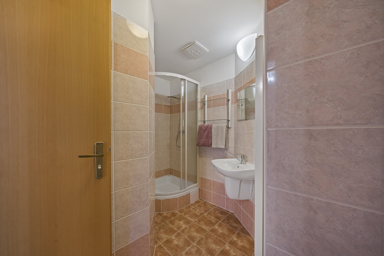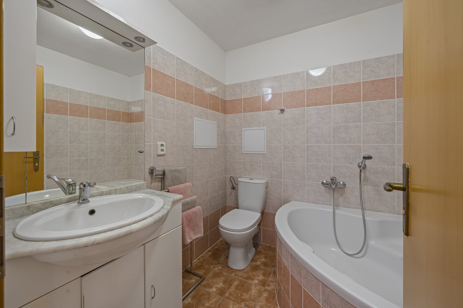 Byt disponuje dvěma koupelnami, jednou s vanou a druhou se sprchovým koutem a