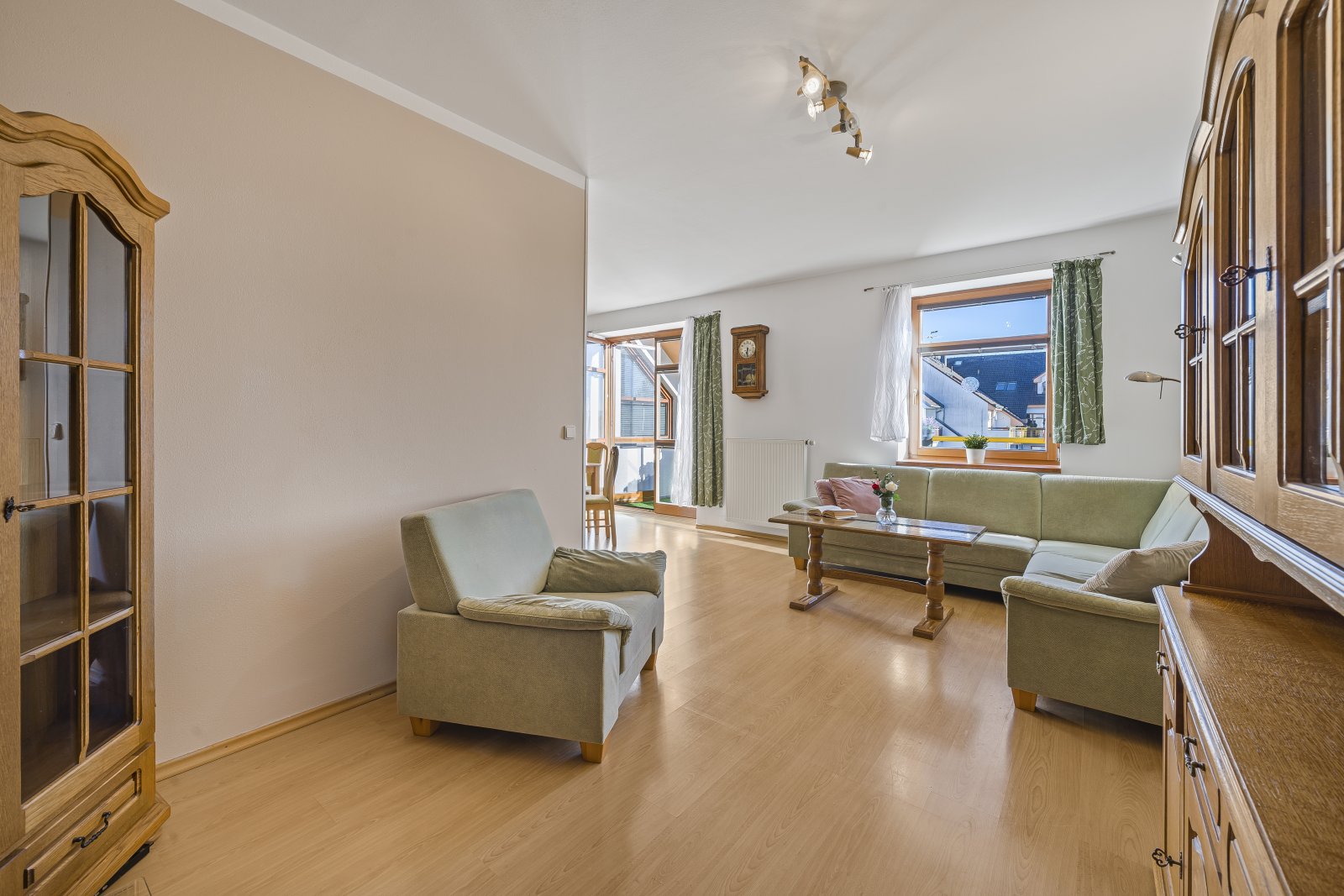 toaletou. Dominantou bytu je prostorný obývací pokoj s kuchyní, která je